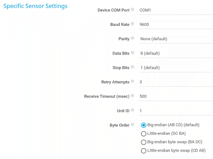 The Modbus RTU Custom sensor connects to a Modbus Remote Terminal Unit (RTU) server and monitors up to ten returned numeric values.