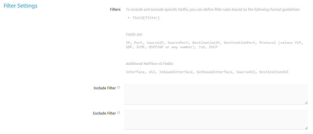 Define if you want to filter any traffic. If you leave this field empty, the sensor includes all traffic. To include specific traffic only, define filters using a special syntax.