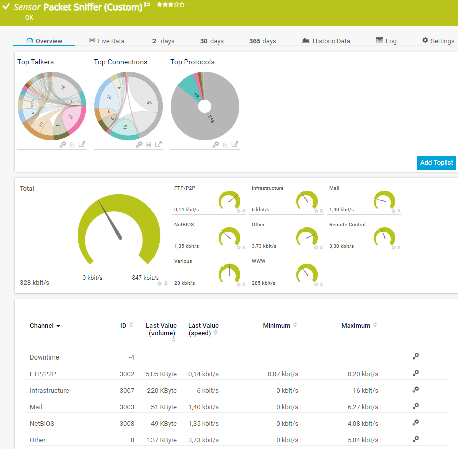 i_round_blueFor all Flow (NetFlow, jFlow, sFlow, IPFIX) and Packet Sniffer sensors, Toplists are available on the sensor's Overview tab. Using Toplists, you can review traffic data for small time periods in great detail.