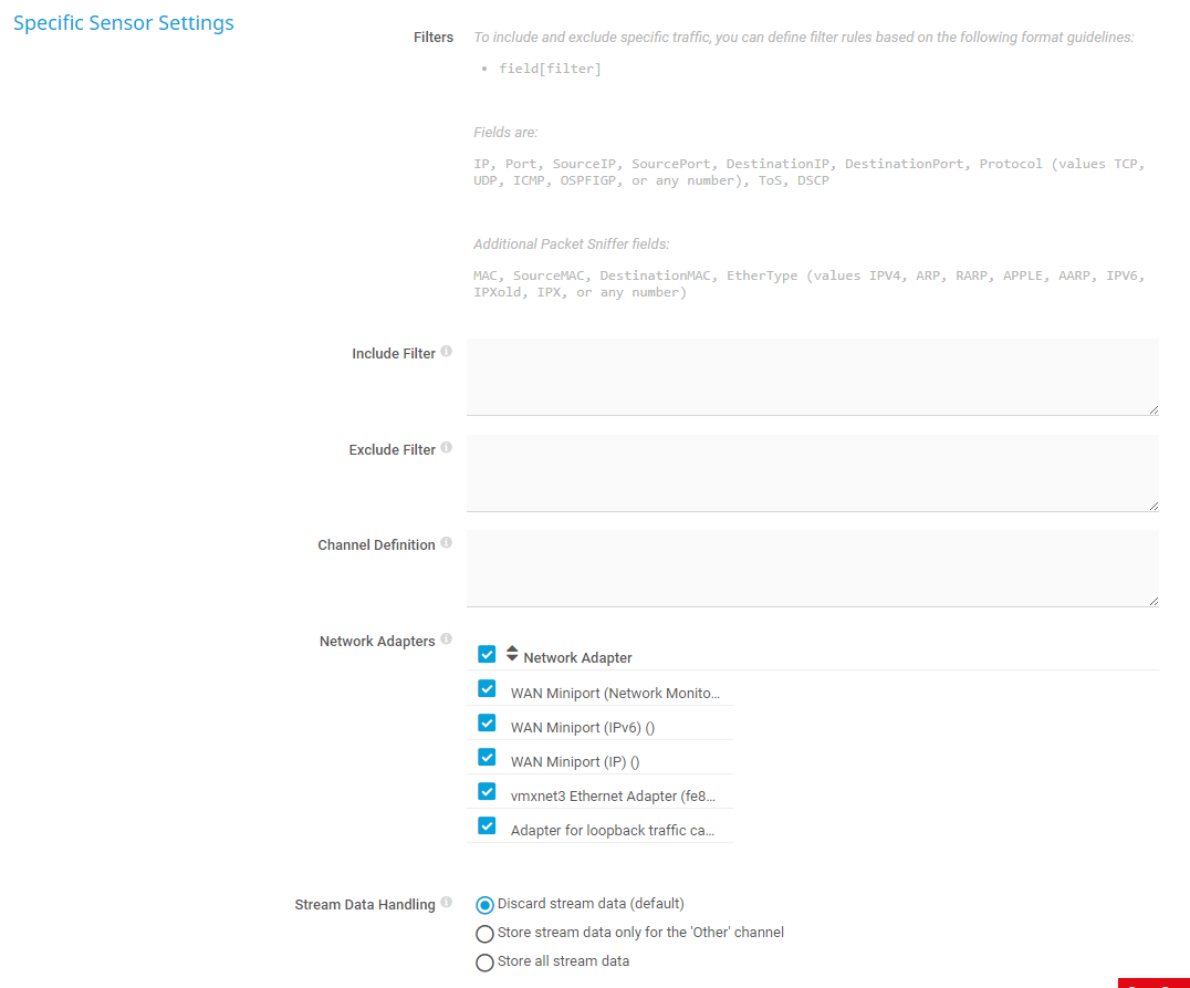 Define if you want to filter any traffic. If you leave this field empty, the sensor includes all traffic. To include specific traffic only, define filters using a special syntax.
